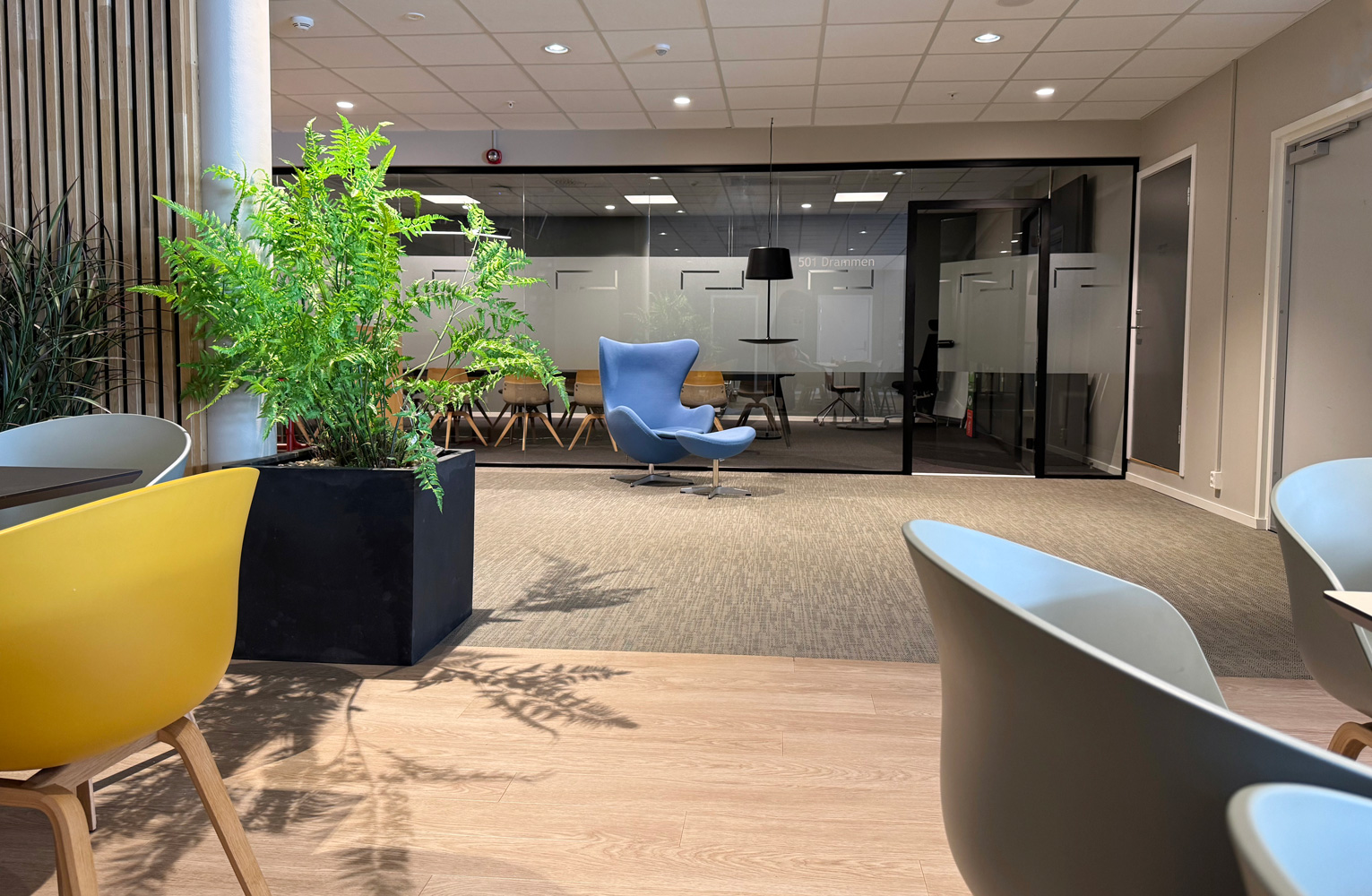 Løsningene forøvrig er nøye planlagt kombinasjon av kontorer, landskap, sosiale soner og møterom med ulik størrelse, utforming og møblering. Varierte treffpunkter og gode arealer til fellesmøter hadde høy prioritet og har blitt populære steder for idémyldring og kompetanseoverføring. Arkitektur og materialkombinasjoner vitner om at BDO Drammen er modig og fremoverlent.