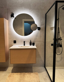 Fliser og tregulv ble valgt med utgangspunkt i de opprinnelige forslagene som lå i prosjektet, og for å bidra til et lyst og naturlig uttrykk. Fargepaletten ble utarbeidet for å passe godt til materialene, møblene og den stilen familien ønsket. Vi utarbeidet et sammenhengende konsept for alle tre etasjene, der farger, materialer, møbler og dekorbelysning støtter hverandre og skaper et rolig og gjennomarbeidet uttrykk. Badene ble detaljert for å sikre funksjonelle og gode løsninger. Innredningen ble valgt med tanke på både praktisk hverdag, estetikk og varig kvalitet.