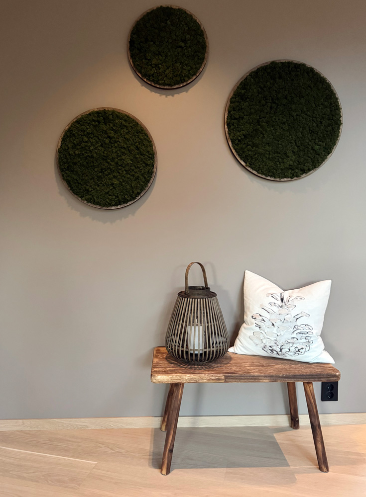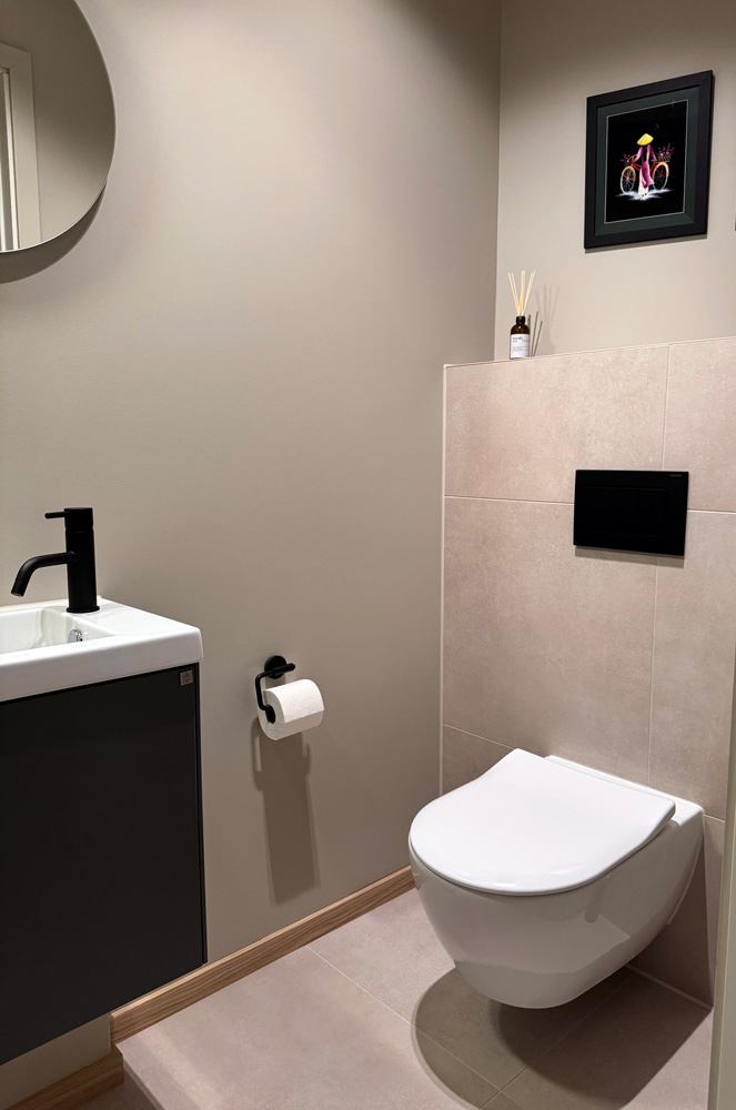 Fliser og tregulv ble valgt med utgangspunkt i de opprinnelige forslagene som lå i prosjektet, og for å bidra til et lyst og naturlig uttrykk. Fargepaletten ble utarbeidet for å passe godt til materialene, møblene og den stilen familien ønsket. Vi utarbeidet et sammenhengende konsept for alle tre etasjene, der farger, materialer, møbler og dekorbelysning støtter hverandre og skaper et rolig og gjennomarbeidet uttrykk. Badene ble detaljert for å sikre funksjonelle og gode løsninger. Innredningen ble valgt med tanke på både praktisk hverdag, estetikk og varig kvalitet.