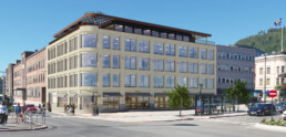 Med Drammenselva på den ene siden og byens torg på den andre, er beliggenheten unik. Eiendommen ble bygget for Kreditkassen i 1975. Selve tomten bygget står på, har en ærverdig historie. Her var Grand Hotel i Drammen lokalisert frem til det brant ned i 1970. Bygget er nylig rehabilitert, og store vindusflater langs to fasader slipper inn rikelig med dagslys og gir en nesten utendørs opplevelse. Det var viktig å ivareta disse kvalitetene i bygget, og vi jobbet målrettet for å få til en god planløsning.