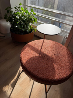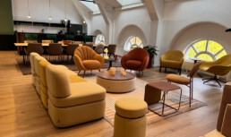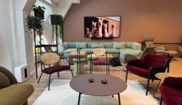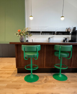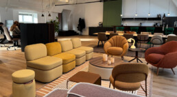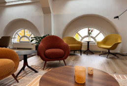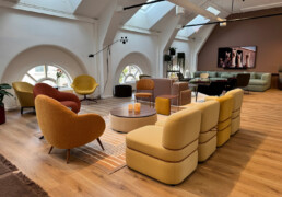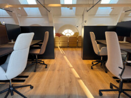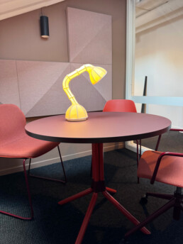 Vi har vært opptatt av å ta vare på det som fungerer av infrastruktur, vegger og fast innredning. Gulvteppet ble skiftet, belysningen oppgradert til LED, og vegger og tak fikk nye farger. Fargevalgene er nøye satt sammen for å gi en rolig, men leken atmosfære, som selskapene kan identifisere seg med.