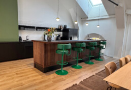 Når du kommer inn døren, møter du et stort, varmt og åpent landskap. Her er det lett å senke skuldrene. Baren, bygget av vår dyktige møbelsnekker, inviterer til en kaffeprat på formiddagen – og kanskje noe annet i glasset når kvelden kommer.