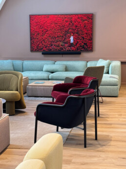 På storskjermen rullerer stemningsfulle bilder som gir rommet stadig nye uttrykk. Lerretet gjør lokalene fleksible for kundepresentasjoner, foredrag og arrangementer – uansett hvor du sitter, er du en del av opplevelsen.