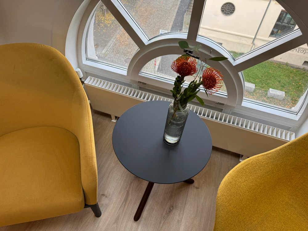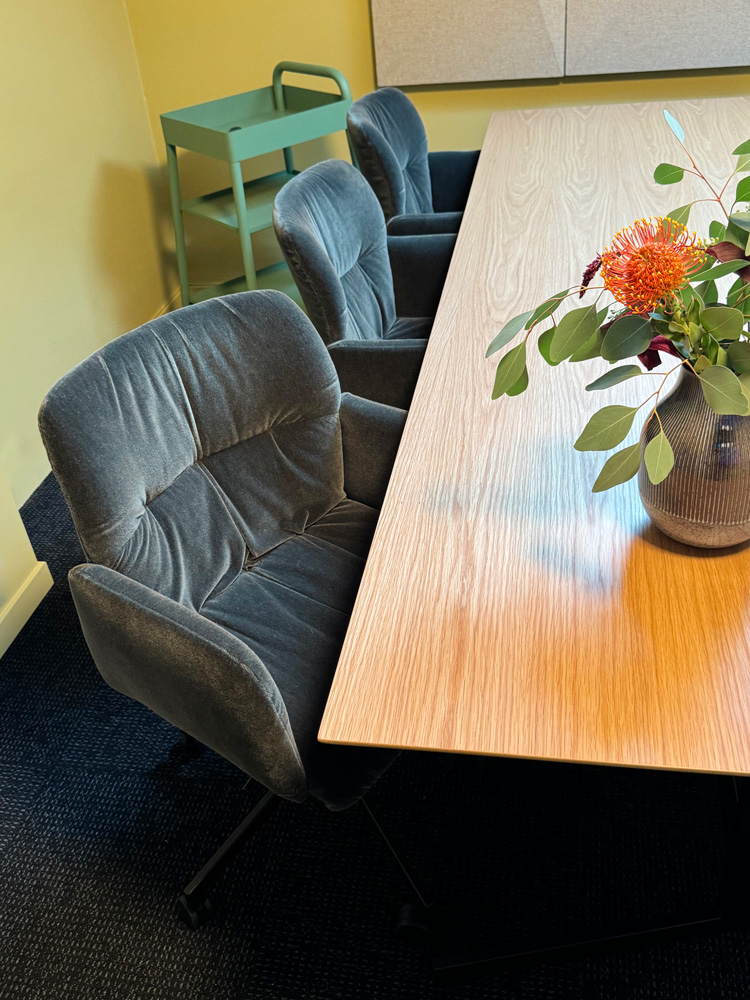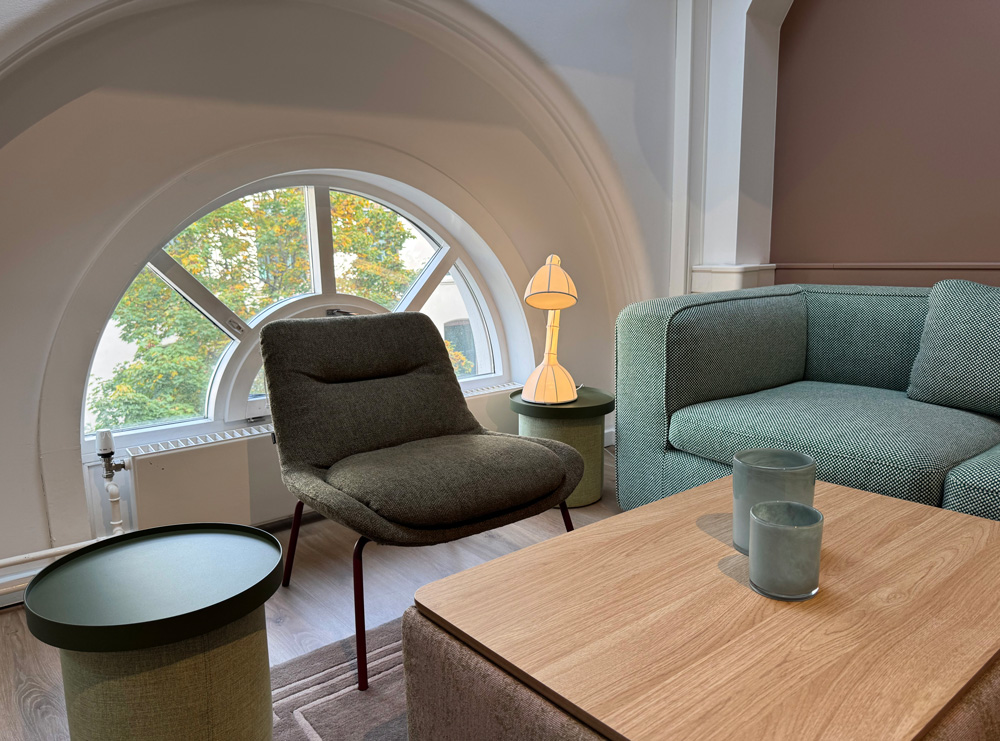 Vi har vært opptatt av å ta vare på det som fungerer av infrastruktur, vegger og fast innredning. Gulvteppet ble skiftet, belysningen oppgradert til LED, og vegger og tak fikk nye farger. Fargevalgene er nøye satt sammen for å gi en rolig, men leken atmosfære, som selskapene kan identifisere seg med.