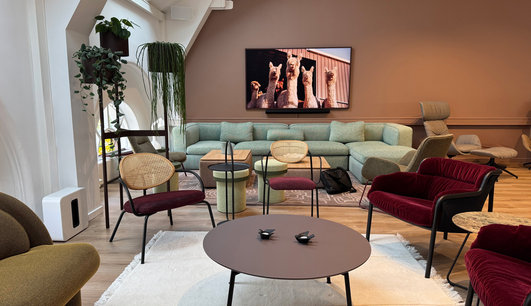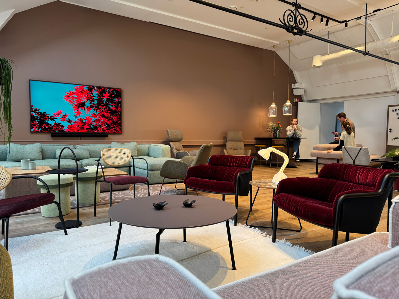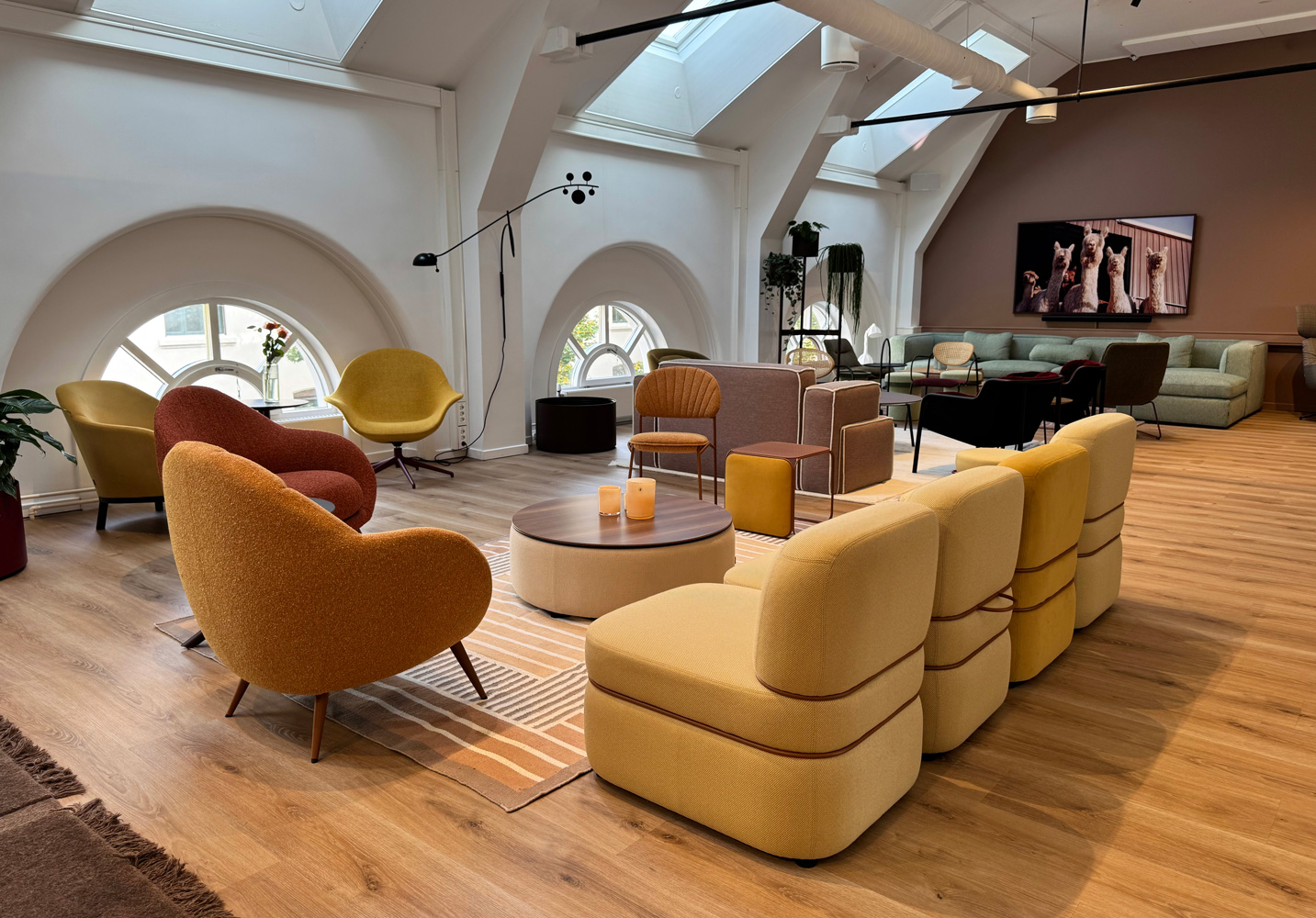 På storskjermen rullerer stemningsfulle bilder som gir rommet stadig nye uttrykk. Lerretet gjør lokalene fleksible for kundepresentasjoner, foredrag og arrangementer – uansett hvor du sitter, er du en del av opplevelsen.