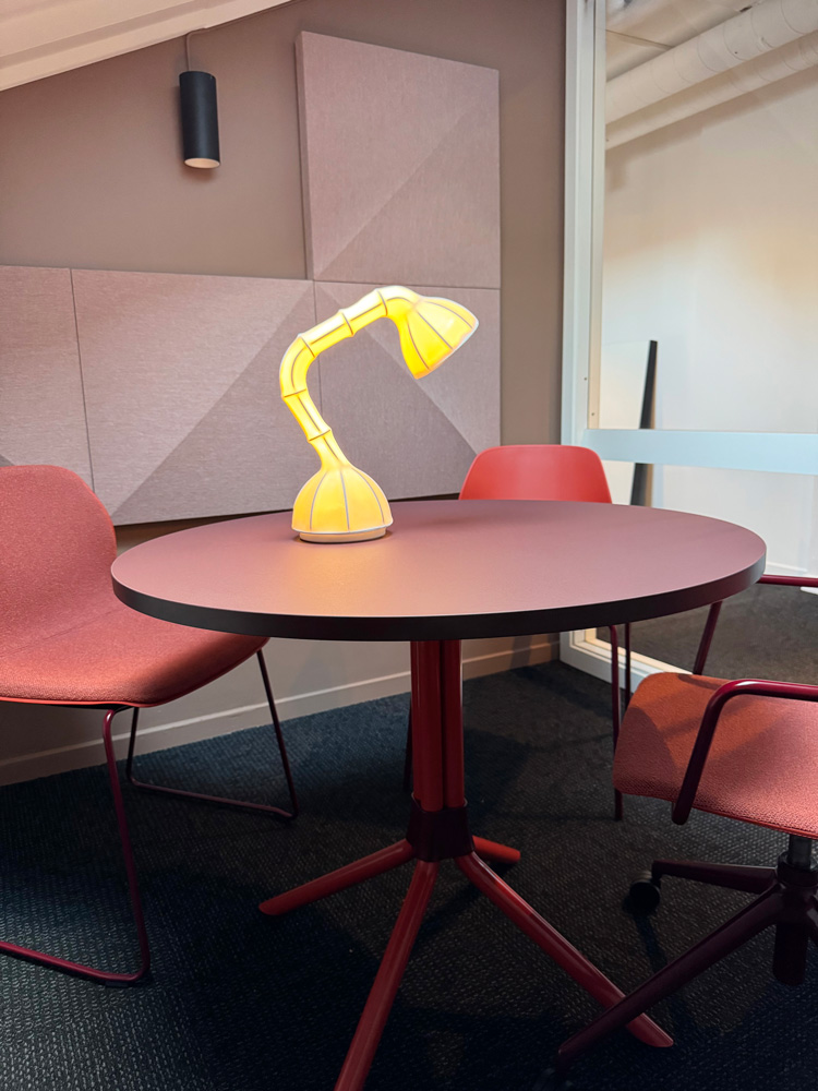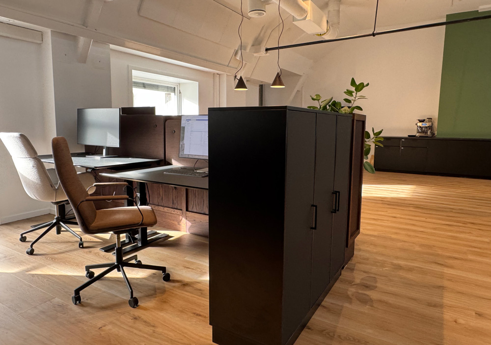 Arbeidsplassene er samlet der lokalet har best dagslys. Johanson sine møbelklassikere skaper soner for både konsentrasjon og samarbeid. Langbordet fungerer som møteplass, spiseplass – eller begge deler samtidig. Tre mindre møterom og et materialbibliotek gir mulighet for ro og fordypning når det trengs.